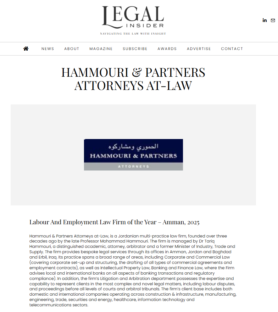 We’re delighted to share that Hammouri & Partners Attorneys at-Law has been awarded “Labour and Employment Law Firm of the Year – Amman, 2025” by Legal Insider, a UK-based organization that annually recognizes outstanding law firms and celebrates excellence and innovation in the legal sector worldwide.